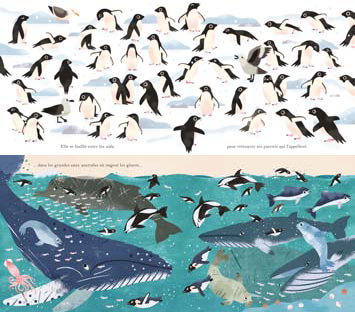 Cet livre a tout d'un documentaire, et pourtant il se lit comme un album. Les pages de garde sont illustrées grâce à de superbes imagiers qui nous montrent les animaux qui vivent sur et sous la banquise. Puis vient l'histoire de cette petite manchot aux yeux bleus. Il est temps pour elle de devenir indépendante. Elle atteint le rivage et plonge dans l'eau glacée avec les autres manchots de son âge. Pour se nourrir, elle doit nager sur plusieurs kilomètres, et sur son chemin, elle rencontre de nombreux autres animaux, mais attention, certains pourraient essayer de la manger...