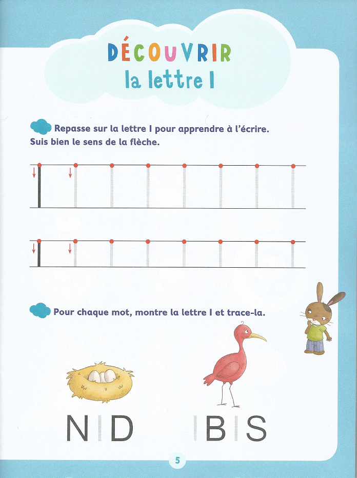 Tout au long des activités, Lapinou, un petit lapin mascotte, suit l'enfant. On le retrouve sur toutes les pages, parfois accompagné de sa famille.