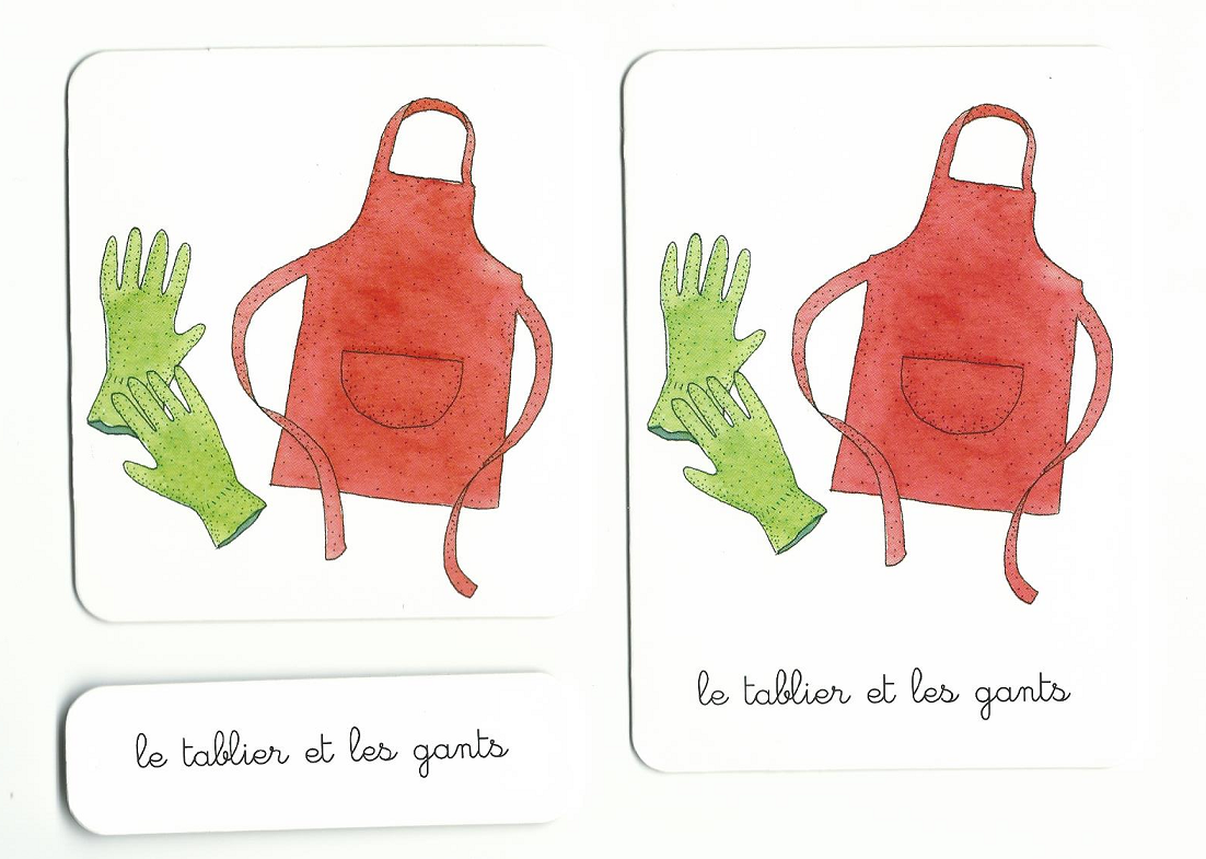 - 3 jeux de 40 cartes : le premier propose une illustration accompagnée de son nom en lettres cursives, le second uniquement l'illustration et le troisième uniquement le nom. Les différents objets présentés se classent en quatre catégories : les outils du jardin, les légumes du potager, les auxiliaires du jardin et les fleurs comestibles.