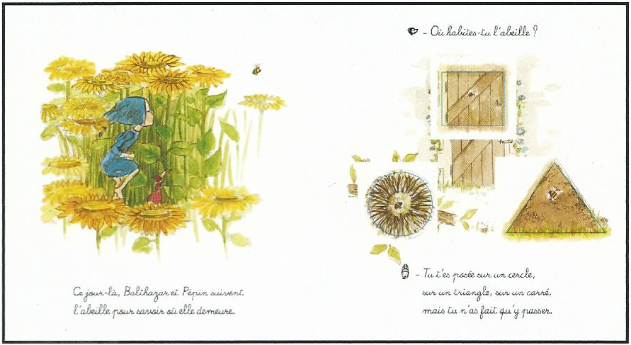 En se promenant dans le jardin et sur la plage, Balthazar découvre les formes géométriques. D'abord le cercle avec le soleil, le triangle avec les rochers, le carré avec les champs, l'hexagone avec les ruches d'abeille...