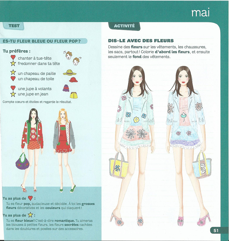 Le livre renferme de nombreux conseils de mode avec beaucoup d'exemples et des silhouettes à compléter et à colorier. Il y a également des quiz, des trucs de mode pour assortir ses accessoires aux vêtements et des mini bloc-notes pour ne rien oublier mois après mois.