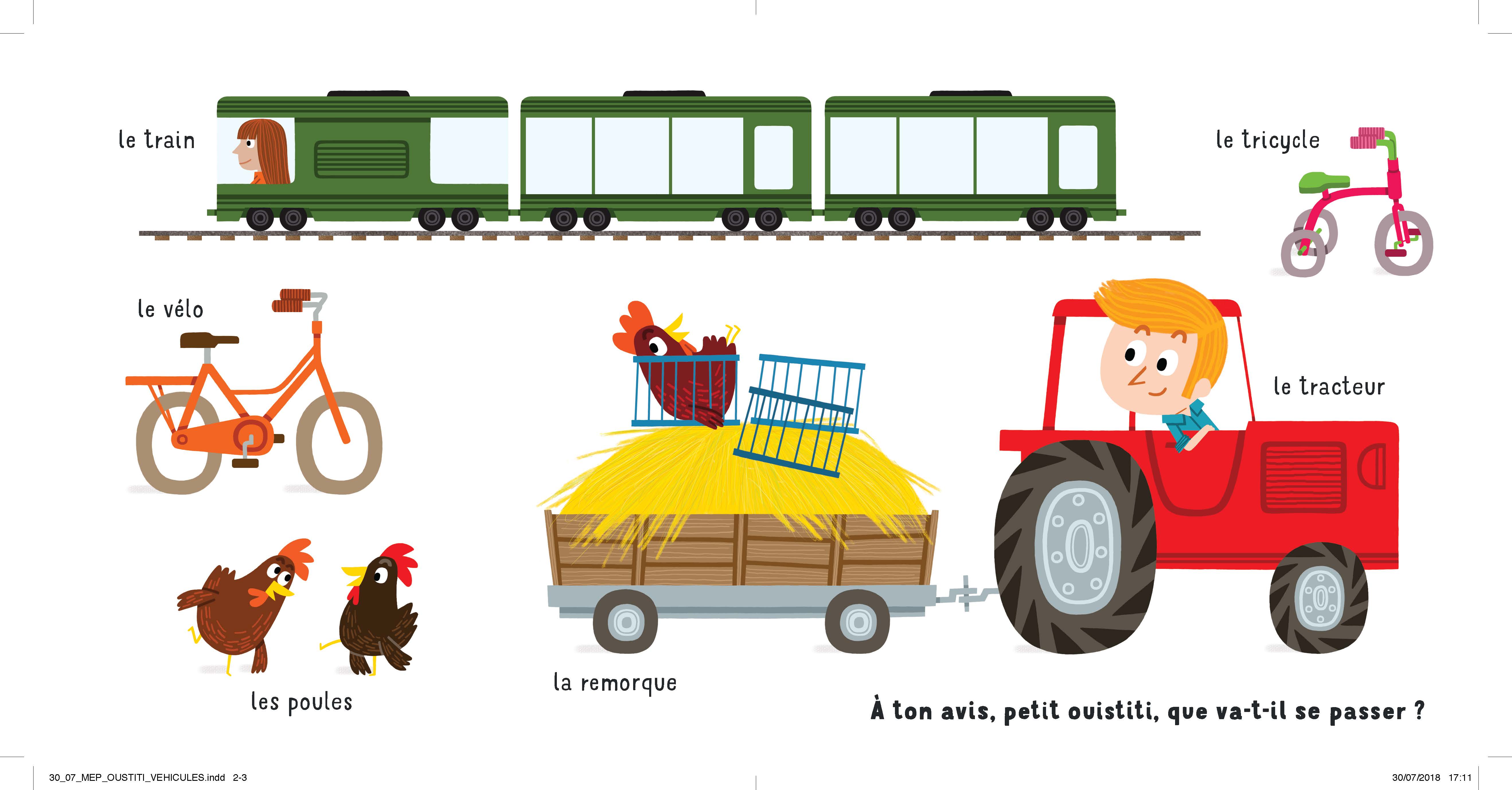 Les doubles pages de l’album vont deux par deux. La première propose de découvrir des noms de véhicules, par exemple le tracteur, le train, le vélo, la remorque, le tricycle, comme dans un imagier classique, avec en plus un intrus (ici les poules) et une petite question : "A ton avis, petit ouistiti, que va-t-il se passer ?".