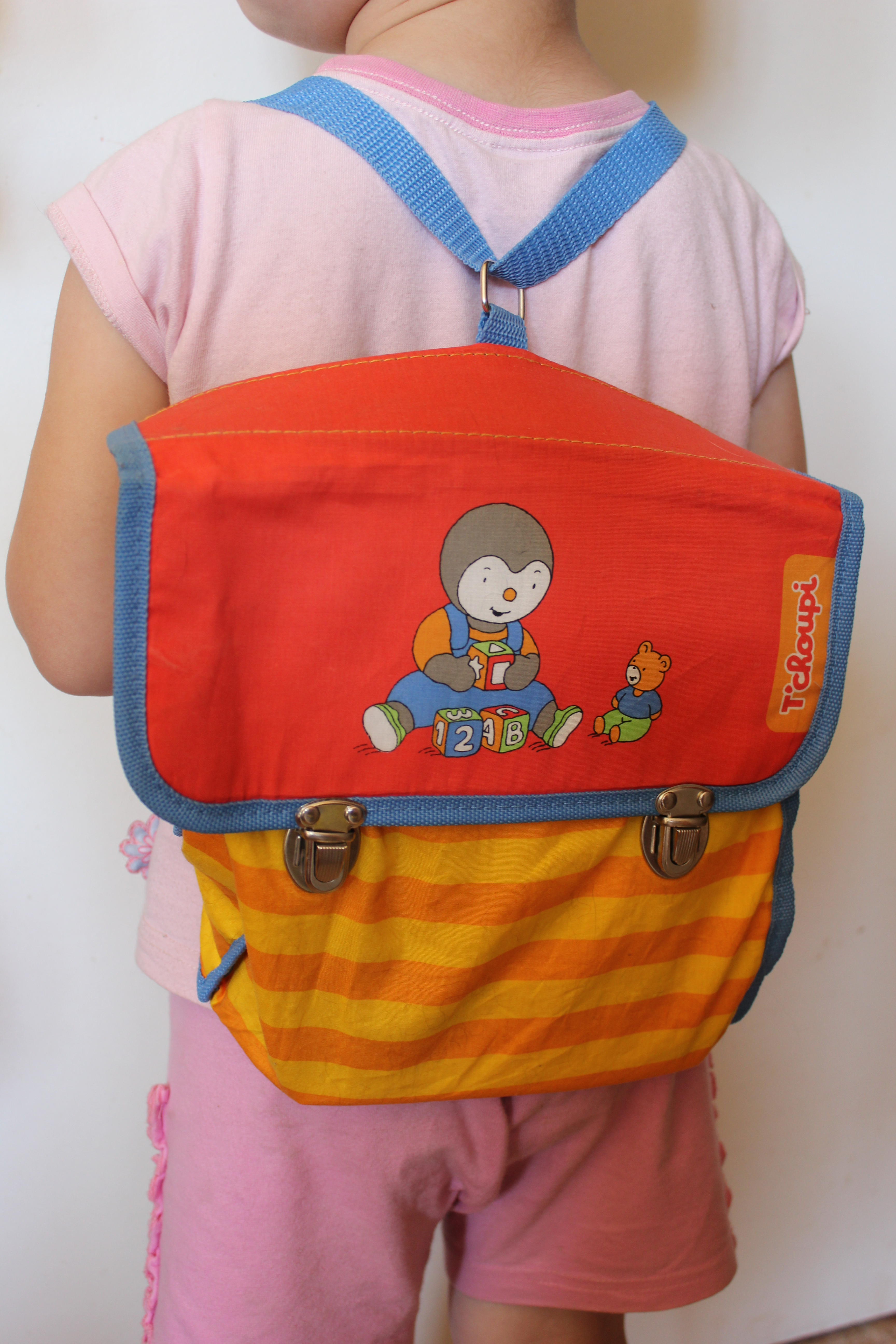 La taille du cartable est parfaite pour un enfant de maternelle. Il permet d'y mettre un goûter, des livres T'choupi et même des livres de plus grande taille de format 19 x 19 cm comme par exemple les livres de la collection Kididoc des éditions Nathan (Vive l'école ! / Grrr ! les dinosaures...).
