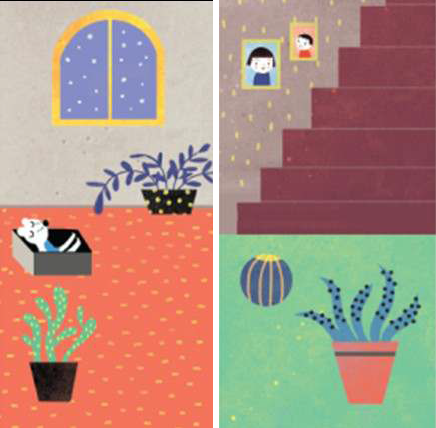 Pour montrer l’attachement de Célia à son ancienne maison, l’auteur la personnifie. La maison éprouve de la peine lorsque Célia et sa famille partent, et retrouve la joie lorsqu’elle découvre ses nouveaux occupants. De même, la nouvelle maison, que Célia n’aimait pas au début, prend vie lorsque Célia commence à l’apprécier à sa juste valeur. C’est mignon. On s’attache beaucoup à cette petite fille qui a du mal à se faire aux changements. La personnification des maisons est assez amusante. Et si l’on regarde bien les images, on découvre plein de petites choses à regarder (dessins accrochés sur le frigo, chat sur le toit…) !