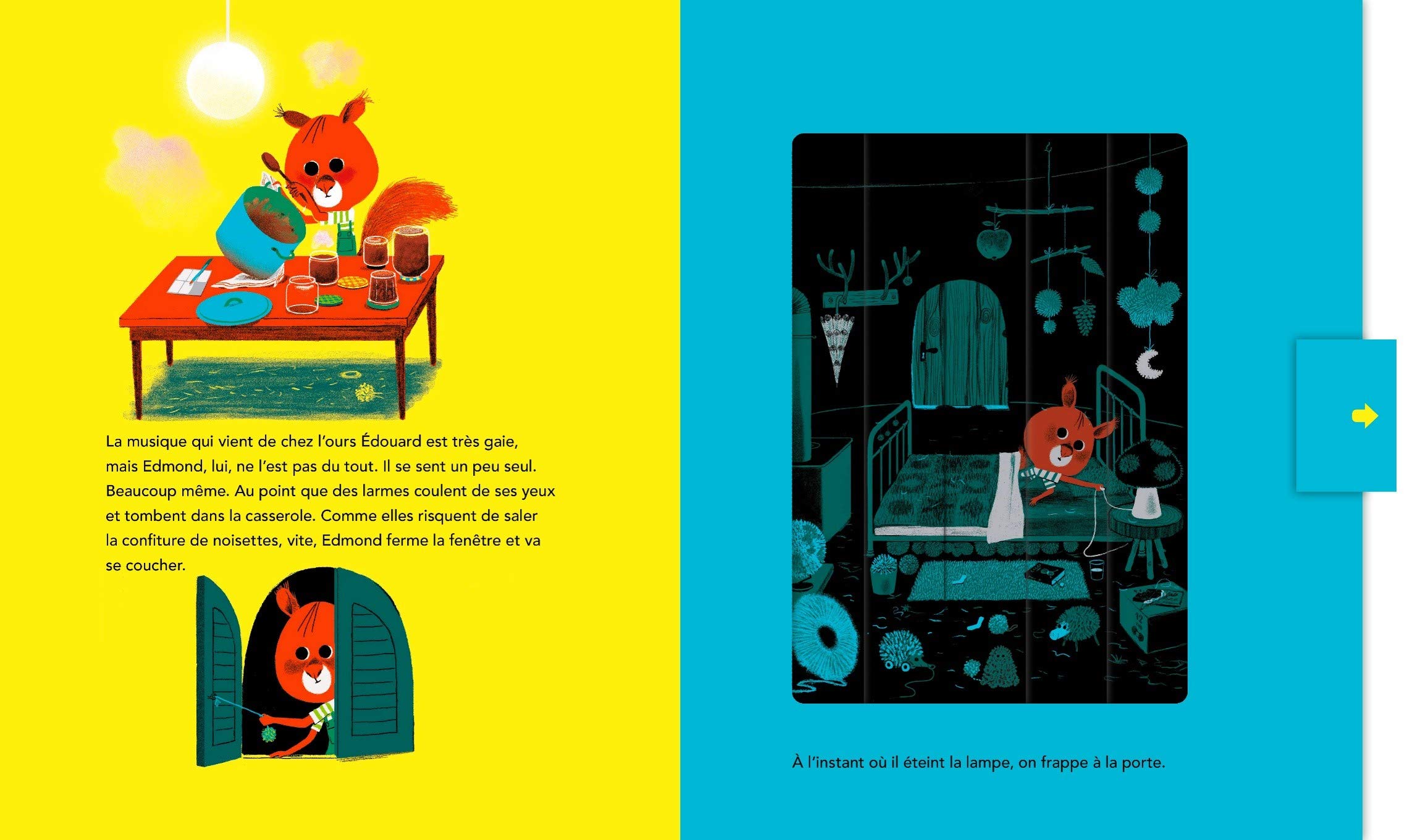 Edmond est un écureuil si timide qu'il n'ose pas parler à ses voisins qui vivent dans le même arbre que lui. Ce soir, une fête est organisée chez un des animaux. Edmond est triste, chez lui, seul. Soudain, on frappe à la porte…