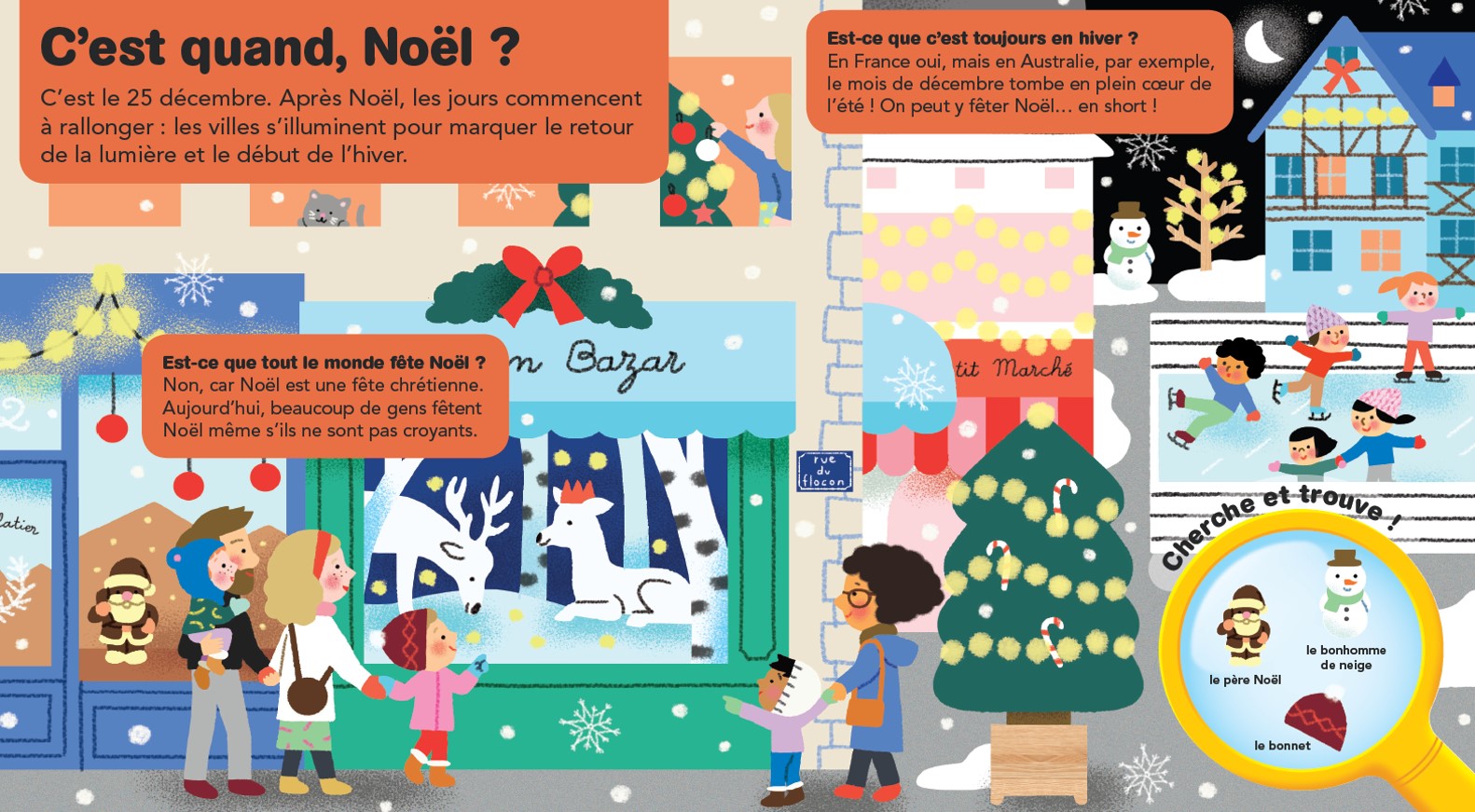 Sur le principe d’un grand thème par double page, l’enfant va tout découvrir sur Noël et les traditions qui l’accompagnent : est-ce que tout le monde fête Noël ? Pourquoi on décore un sapin ? Que représente la crèche ? Qui est saint Nicolas ?