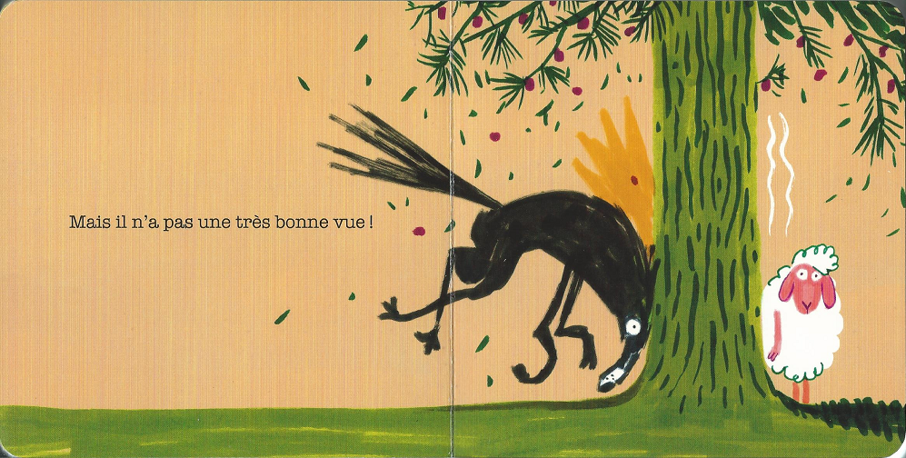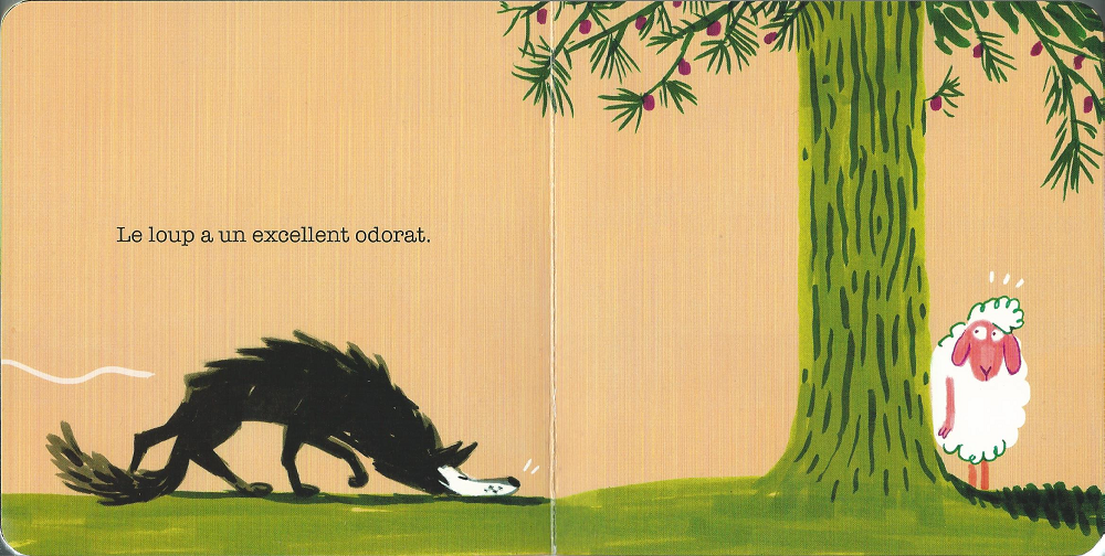 On y apprend beaucoup de choses : que les loups avancent à la queue leu leu, qu'en hiver le loup a un épais manteau de fourrure et qu'au printemps il mue, qu'il a un excellent odorat mais pas une bonne vue, qu'il fait pipi pour marquer son territoire... et tout cela à chaque fois avec des illustrations drôles et parfois des situations à enchaînement comme ci-dessous.