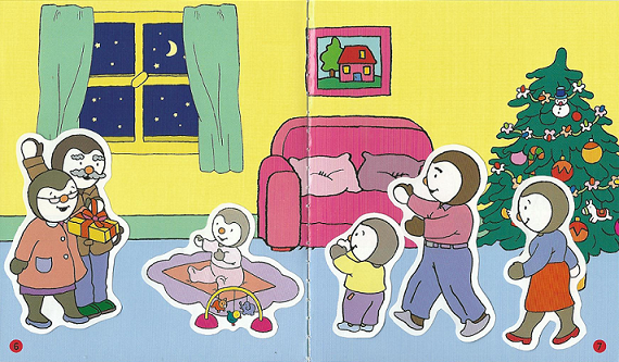 T'choupi – Noël met en scène T'choupi et toute sa famille dans la maison de T'choupi la veille et le jour de Noël dans 4 décors dont 2 sur des doubles pages également.