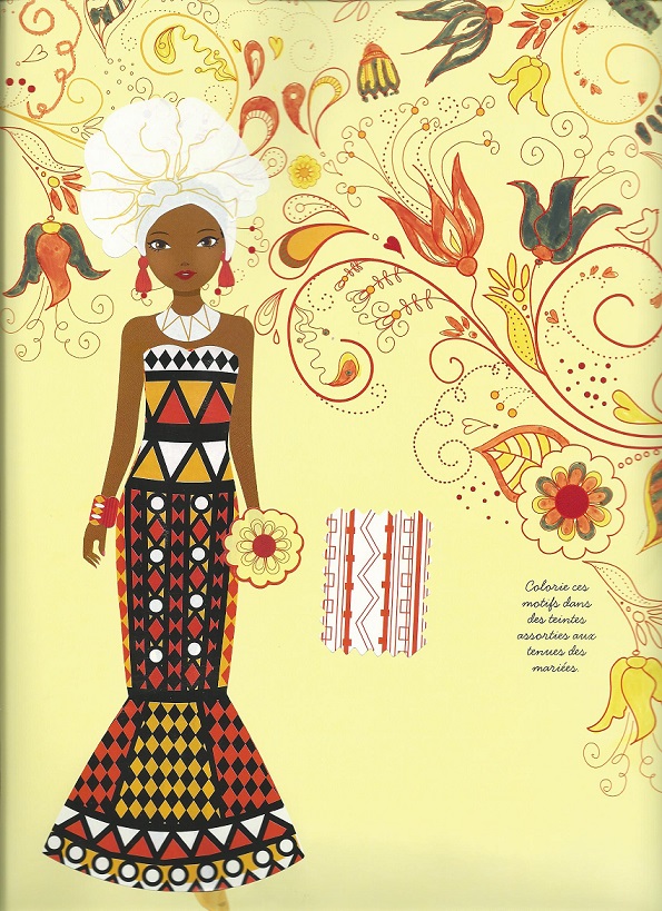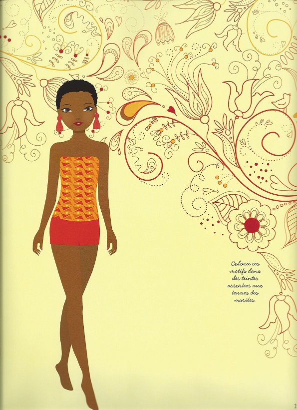Décorer, colorier, coller des autocollants, les jeunes amateurs de mode vont adorer créer leur propre collection de robes de mariée. Chaque double page renferme des modèles à compléter suivant les indications données. Ainsi, on démarre avec une page nue comme ci-dessous :