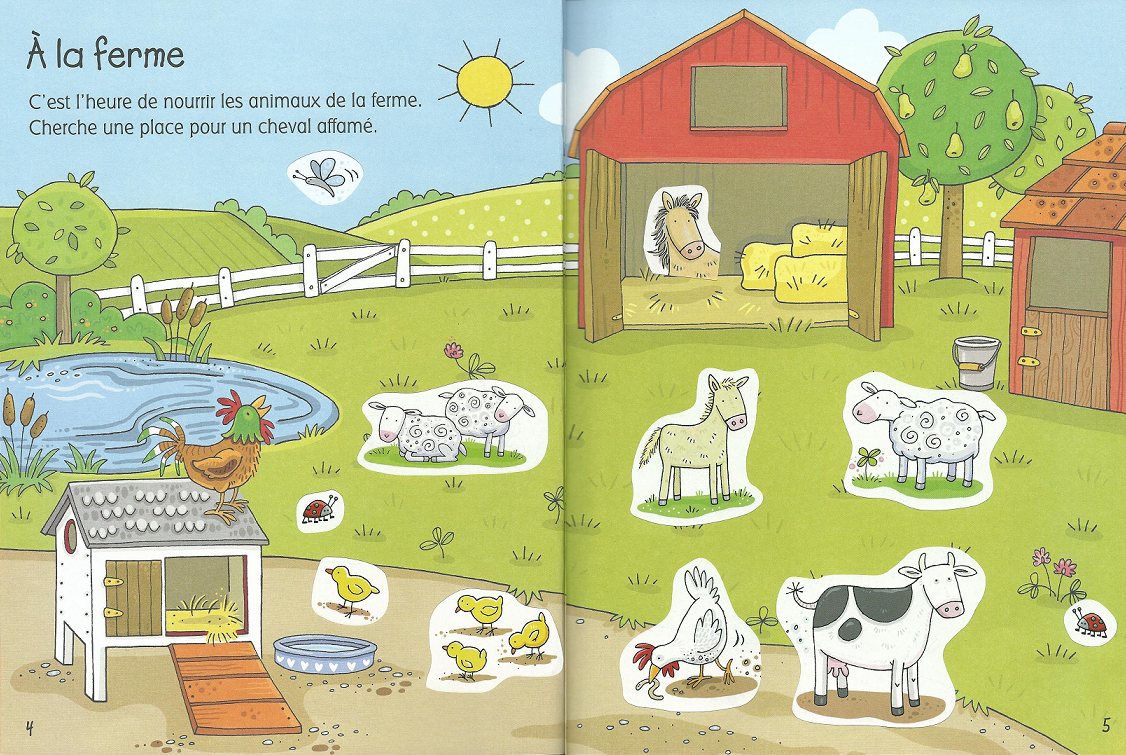 La première propose de grands paysages à compléter avec des autocollants. Le désert, la ferme, la savane, le monde enneigé... des décors grâce auxquels l'enfant découvre les animaux qui y vivent car les pages d'autocollants sont numérotées comme les décors. L'enfant ne peut donc pas se tromper et ne risque pas de mettre un lion dans la ferme. Les décors sont très détaillés, si bien qu'une fois les autocollants installés, c'est une très belle scène qui est représentée.