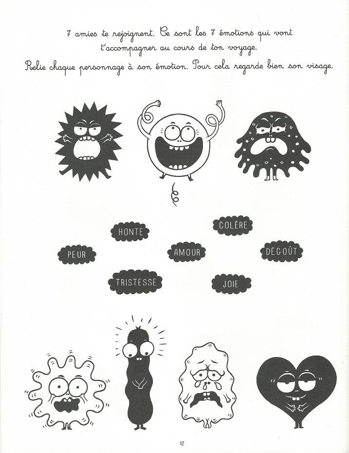 Dans la première partie de l'album, l'enfant va découvrir les émotions dans des situations concrètes illustrées (la peur d'un chien, la colère quand il n'a pas ce qu'il désire...). À la fin de cette première partie, il obtiendra le diplôme du découvreur qu'il pourra découper. La seconde partie va aider l'enfant à mettre des mots sur ce qu'il ressent en le mettant lui-même dans des situations concrètes. Exemple : « La maîtresse te punit car elle croit que tu as écrit sur les murs (Alors que ce n'est même pas toi !). Dessine-toi. Quelle émotion ressens-tu ? »