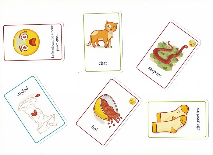 - un mémory des émotions : le jeu se présente comme un mémory classique, mais dans lequel l'enfant doit associer une illustration avec une carte « émoticône » et faire une phrase pour expliquer le lien entre les deux comme : « Le bonhomme pleure car il a renversé son bol de chocolat chaud ».