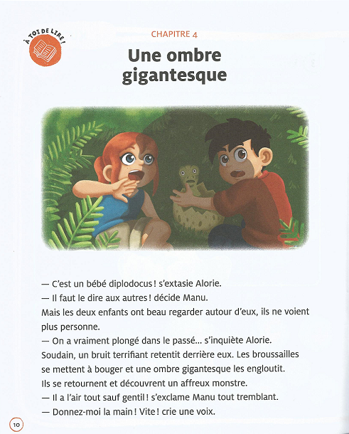 Alorie et Manu reviennent pour une nouvelle histoire accompagnée de jeux de lecture. Alors qu'ils visitent un parc de dinosaures avec leur classe, Manu bute dans un œuf ...de dinosaure ! Un bébé diplodocus en sort et les enfants sont plongés dans le passé. Très vite, ils deviennent la cible des prédateurs...
