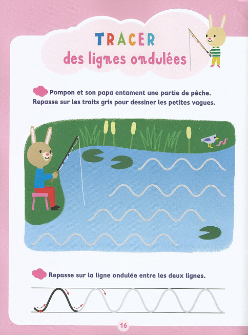 Chaque page propose de s'entraîner à tracer un trait particulier, d'abord en complétant un dessin, puis en reproduisant ce trait sur une ligne.
