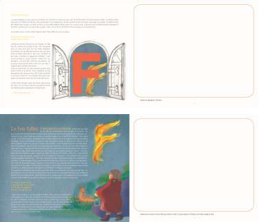 2e jour : l’enfant parle du conte découvert la veille. Il regarde la première illustration du conte et reproduit sur la page blanche l’élément principal du conte (exemple : un feu follet) qui deviendra une lettre (F), et peut également compléter son dessin tant qu’il respecte le conte.