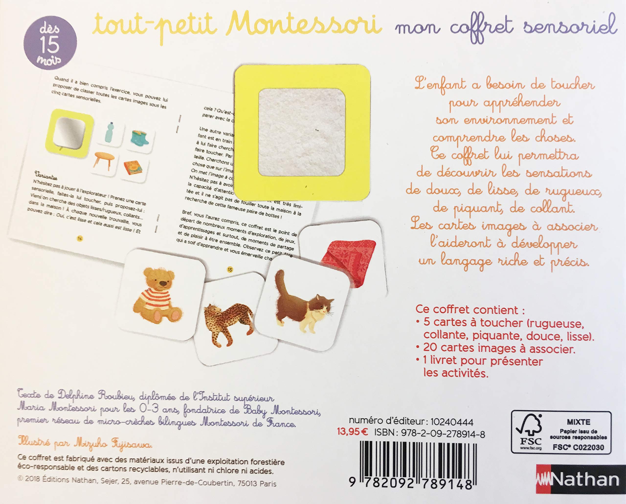 5 cartes à toucher et 20 cartes images à associer pour découvrir les sensations. Collection Tout-petit Montessori, dès 15 mois.