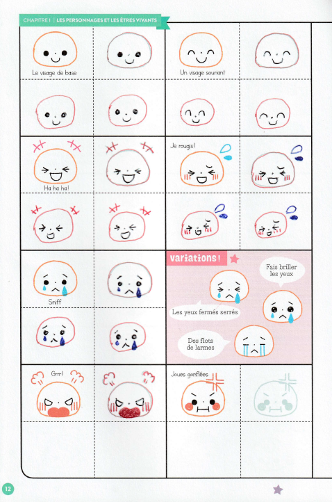 Les dessins sont tous aussi mignons les uns que les autres : j'aimerais tous les faire mais il faut y aller doucement sinon je ne vais pas y arriver et je ne vais pas améliorer mon niveau en dessin. Une des choses bien dans ce « Dessine Kawaii », c'est que tout est expliqué étape par étape: on ne nous donne pas juste le dessin final et on se débrouille. Là, il y a trois étapes pour chaque dessin. On ne commence pas non plus avec directement un corps en entier, mais pour « les gens », par exemple, on s'occupe d'abord de la tête, ensuite des têtes avec un ou deux mouvements où l'on voit les mains et enfin on finit avec le corps en entier mais avec des postures très simples au début.