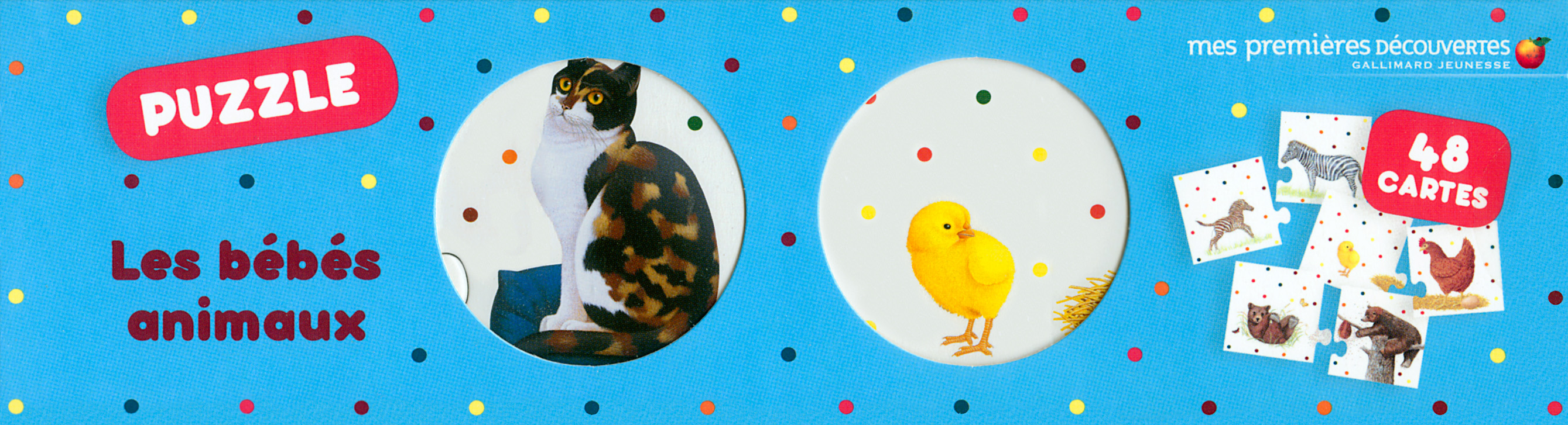 Une boîte comprenant 48 cartes-puzzle pour jouer à associer les animaux et leurs bébés. Collection Mes premières découvertes Gallimard jeunesse, à partir de 3 ans.