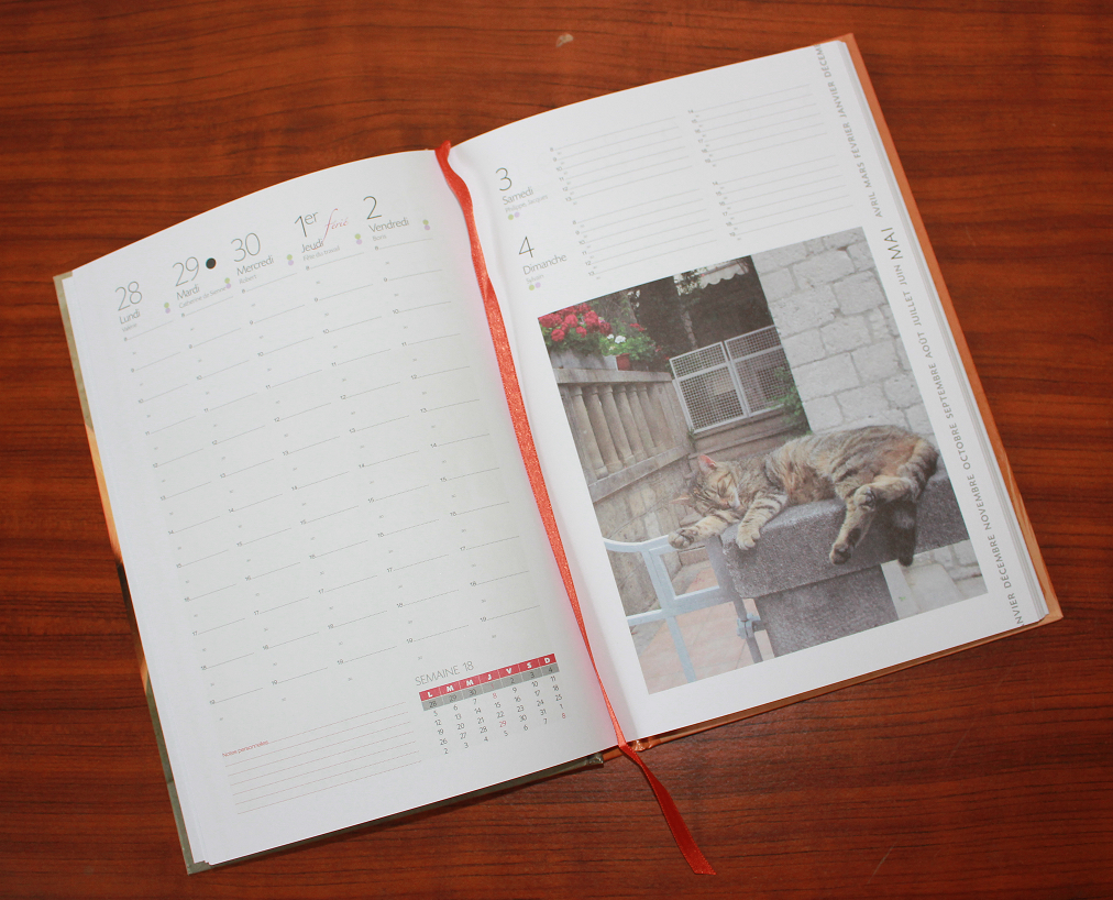 Amoureux des chats, cet agenda est fait pour vous ! Chaque double page d'agenda renferme une photo de chat : qu'il dorme, qu'il joue, qu'il fasse sa toilette, qu'il guette sa proie ou qu'il monte à un arbre, si vous êtes comme moi et que vous les trouver adorables, vous ne pourrez faire que craquer !
