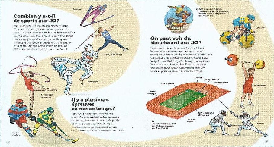 Autant de questions que peuvent se poser les enfants en regardant les Jeux Olympiques et auxquelles ils trouveront des réponses courtes et simples. Chaque double page évoque un thème et répond à deux ou trois questions. Les réponses sont systématiquement accompagnées d'une illustration et d'autres informations viennent parfois les accompagnés : des anecdotes ou des points incroyables.