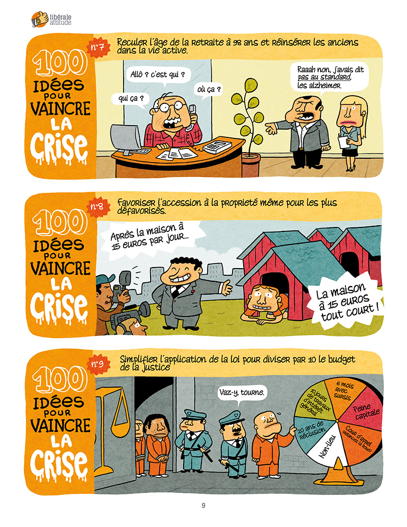 La crise. Mot qui fait peur mais en même temps qui fait parfois rire tellement il est utilisé à outrance. Dans Libérale attitude, on en rit de cette crise, et de deux manières : D'une part, en développant à l'extrême des idées déjà connues comme pousser l'âge de la retraite à 98 ans ou encore faciliter l'accession à la propriété aux plus démunis en leur vendant des logements (niches pour chiens) à 15€ tout court ! Ces petites blagues se présentent sous forme de fiches intitulées « 100 idées pour vaincre la crise ». Ce sont des petits bijoux de plaisanteries qui font mouche, à condition bien sûr d'avoir l'esprit ouvert. D'une autre part, nous avons aussi les blagues pleines pages qui, elles, proposent des scènes de la vie la plupart du temps dans le monde du travail. Je les ai trouvé un peu moins drôles que les fiches pratiques mais d'un autre côté, elles permettent de souffler un peu et de décoller un peu de l'humour particulièrement drôle mais parfois mal placé voire même un peu abject des fiches.